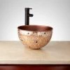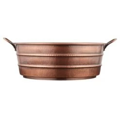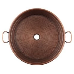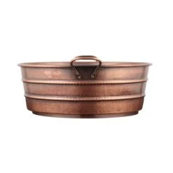 The 18″ Copper Bucket Sink has an above-counter design that places the basin on full display in your bathroom. Hammered detailing, decorative handles, and raised rings add unique style to this item. The bottom of the bowl is smooth to guide water to the drain.