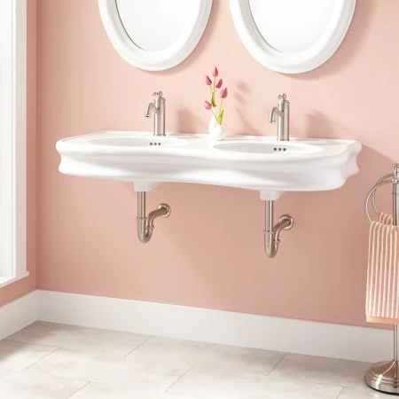 The 46″ Adler Sink brings lasting style to your master bathroom. This product features two bowls and simple wall mounted installation. Made of durable vitreous china, the Adler is the perfect addition to a stylish remodel.