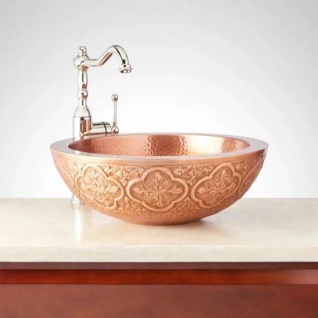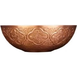 Delicate flowers and leaves are captured in a classic quatrefoil design on the 18″ Bellis Copper Vessel Sink, a charming bathroom update. This hand-polished sink is made of solid copper and features an ingrained patina crafted of French hot process.